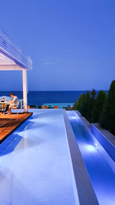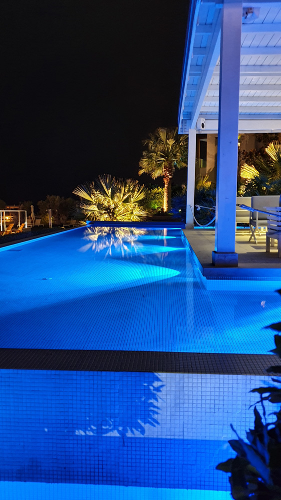 The breakfast and restaurant area operates indoors or outdoors depending on the season. In any case, the view of the garden and the pool is unobstructed. The outdoor restaurant “Nero” is literally on the… water, creating an unprecedented sense of coolness.