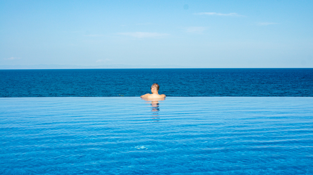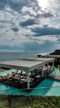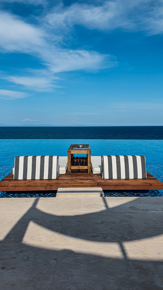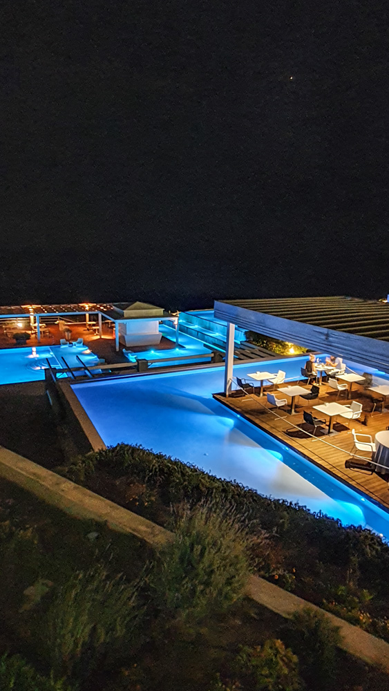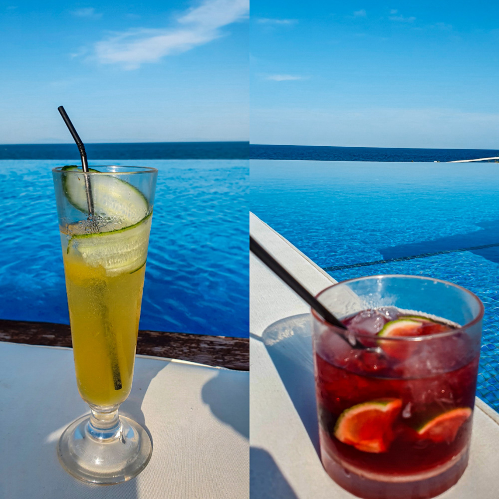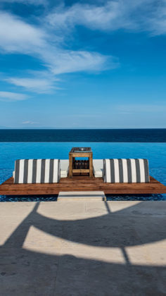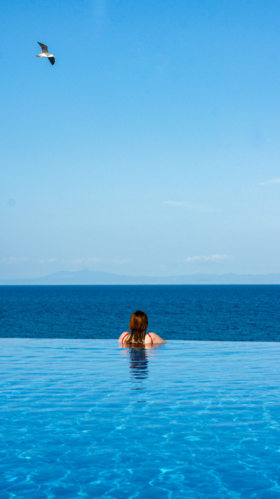 Undoubtedly, the “strong card” of Cavo Olympo is the infinity pool. Here, time freezes and you are left carefree in its panoramic view and shades of blue. Your eye gazes at the Thermaikos Gulf and reaches all the way to Halkidiki, while if you look behind you, the majestic Olympus looms. We could sit for endless hours on the comfortable mattresses above the water, enjoying refreshing cocktails and delicious snacks.